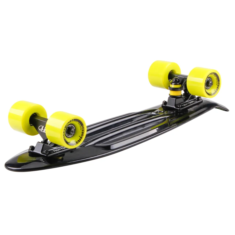 Из технических характеристик, важных для райдеров производитель акцентирует внимание на материале изготовления. Ударопрочный полипропилен длительное время сохраняет первоначальные характеристики, стойкий к механическому воздействию. Поверхностная часть деки размером 22 дюйма покрыта нескользящей шкуркой, исключающей риск случайного соскальзывания стоп, увеличивающая степень безопасности ездока. Подвеска скейтборда размером 3,25 дюйма изготовлена из прочного алюминия. Бушинги имеют параметры жесткости 85А.