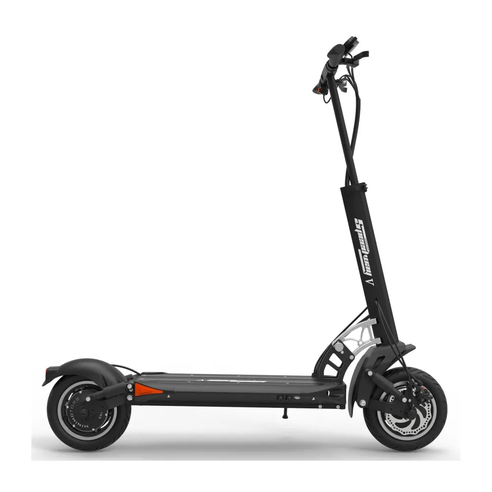 Заявленная максимальная скорость 65 км, это делает самокат скоростным, те кто любит быстрое движение, оценят. Широкие колеса 10 дюймов придают устойчивости и уверенности в повороте, на каждое колесо предусмотрен дисковый тормоз, есть функция рекуперации, ABS система.