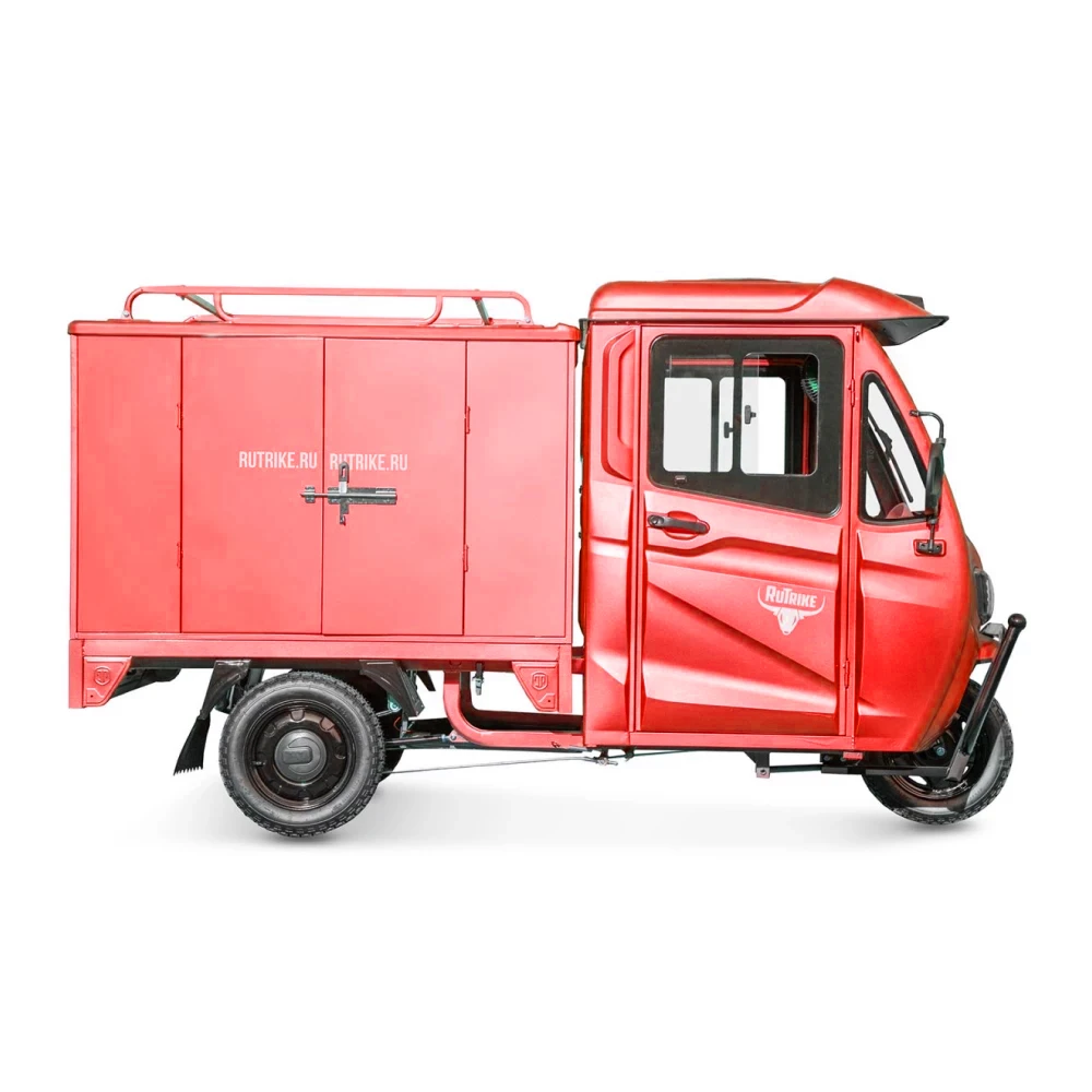 Грузовой электротрицикл Rutrike КАРГО Кабина Дуал красного цвета - это инновационное транспортное средство, которое сочетает в себе эффективность, экологичность и функциональность. Сконструированный для перевозки грузов, этот электротрицикл обладает высокой проходимостью и надежностью.