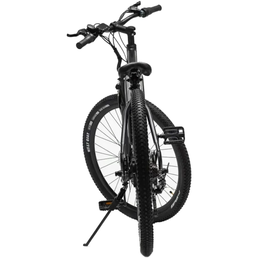 Модель превзошла ожидания пользователей. 27,5 дюймовые колеса с глубоким протектором без труда преодолевают разные вида грунта. 21-скоростняа трансмиссия увеличивает степень удобства при выборе скоростей. Наличие переднего амортизатора допускает езду по неровностям, практически исключает вибрации. При мощностных параметрах двигателя в 350 Вт максимально выдаваемая техникой скорость достигает 28 км/час, а максимальная дистанция на одной подзарядке батареи - 45 км. Комфорт пользования обеспечен регулируемым по углу наклона рулем, регулируемым по ростовым параметрам анатомическим седлом. Наличие багажника высвобождает руки после езды в магазине, допускает перевозить средние грузы. Информационный дисплей предоставляет скоростные данные, степень зарядки аккумуляторной батареи и другие параметры.