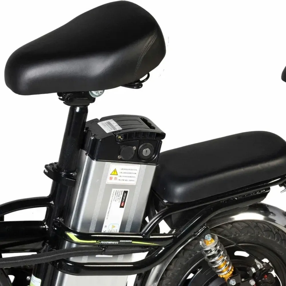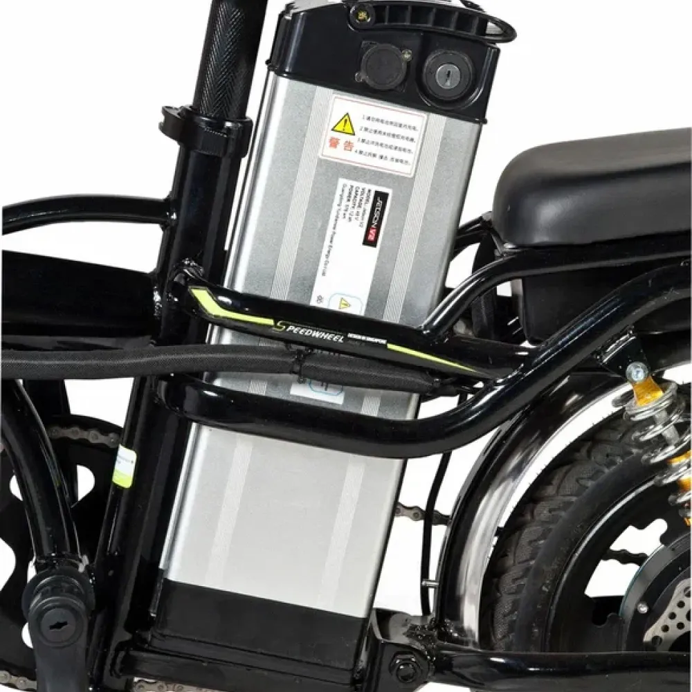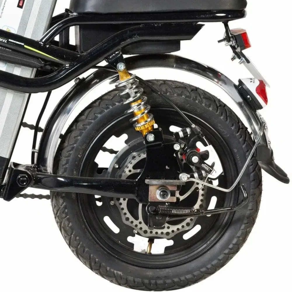 Мощность электровелосипеда составляет 350 Вт. В сочетании с емким АКБ способна развивать скорость до 45 км/час и преодолевать приличные расстояния. Размещение батареи удобное, не вызывает дискомфорта при езде, не мешает пассажиру. Комплектация электровелосипеда максимальная. Допускает безопасную езду в ночное время и непогоду.
